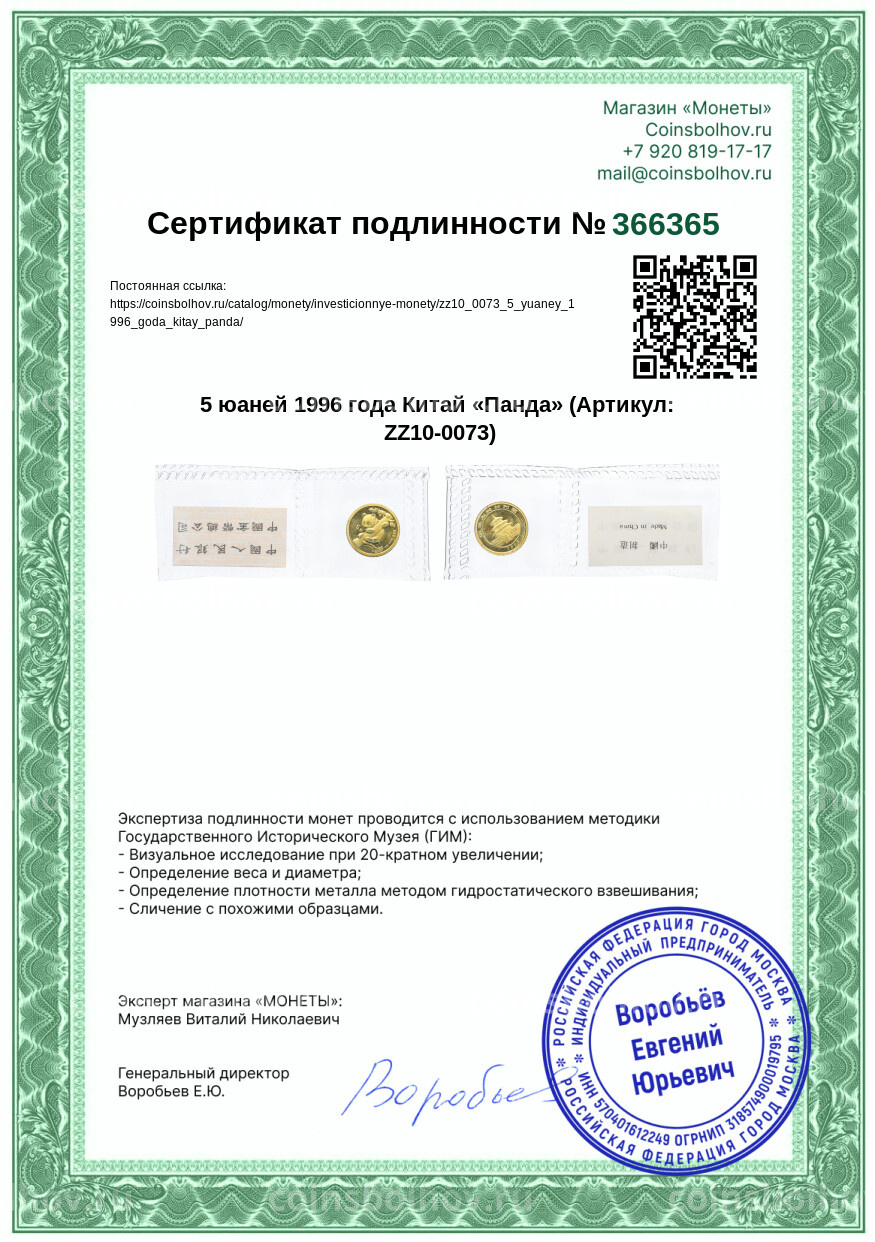 Монета 5 юаней 1996 года Китай «Панда»