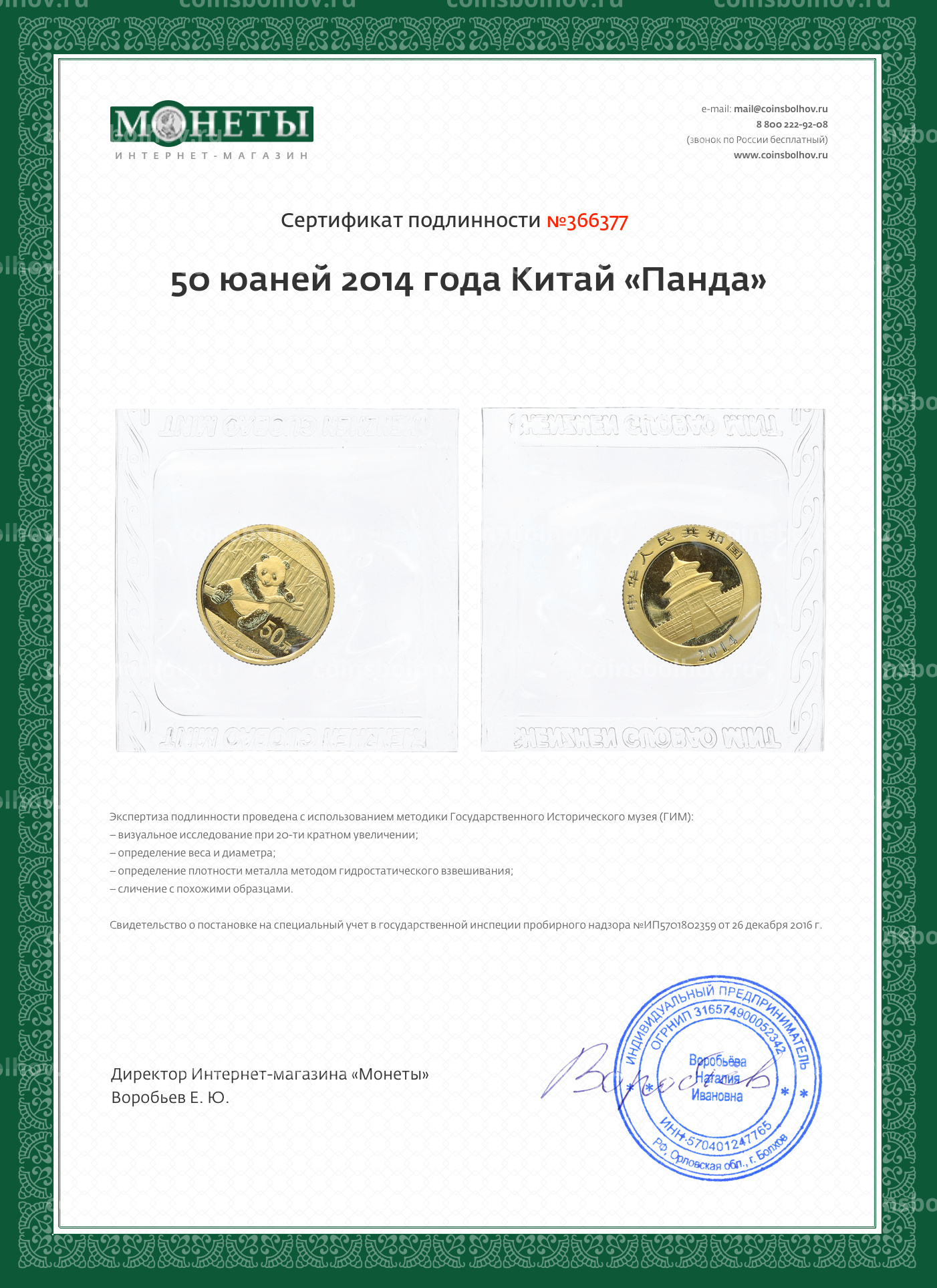 Монета 50 юаней 2014 года Китай «Панда»
