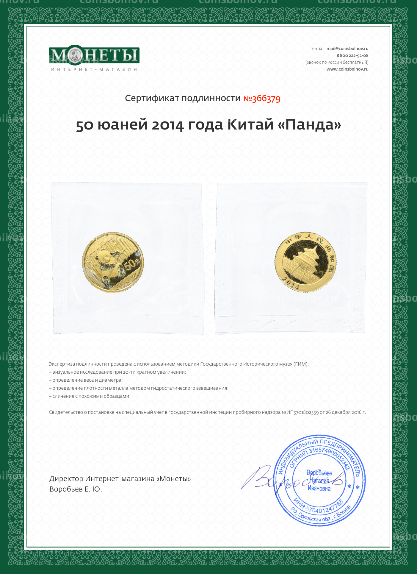 Монета 50 юаней 2014 года Китай «Панда»