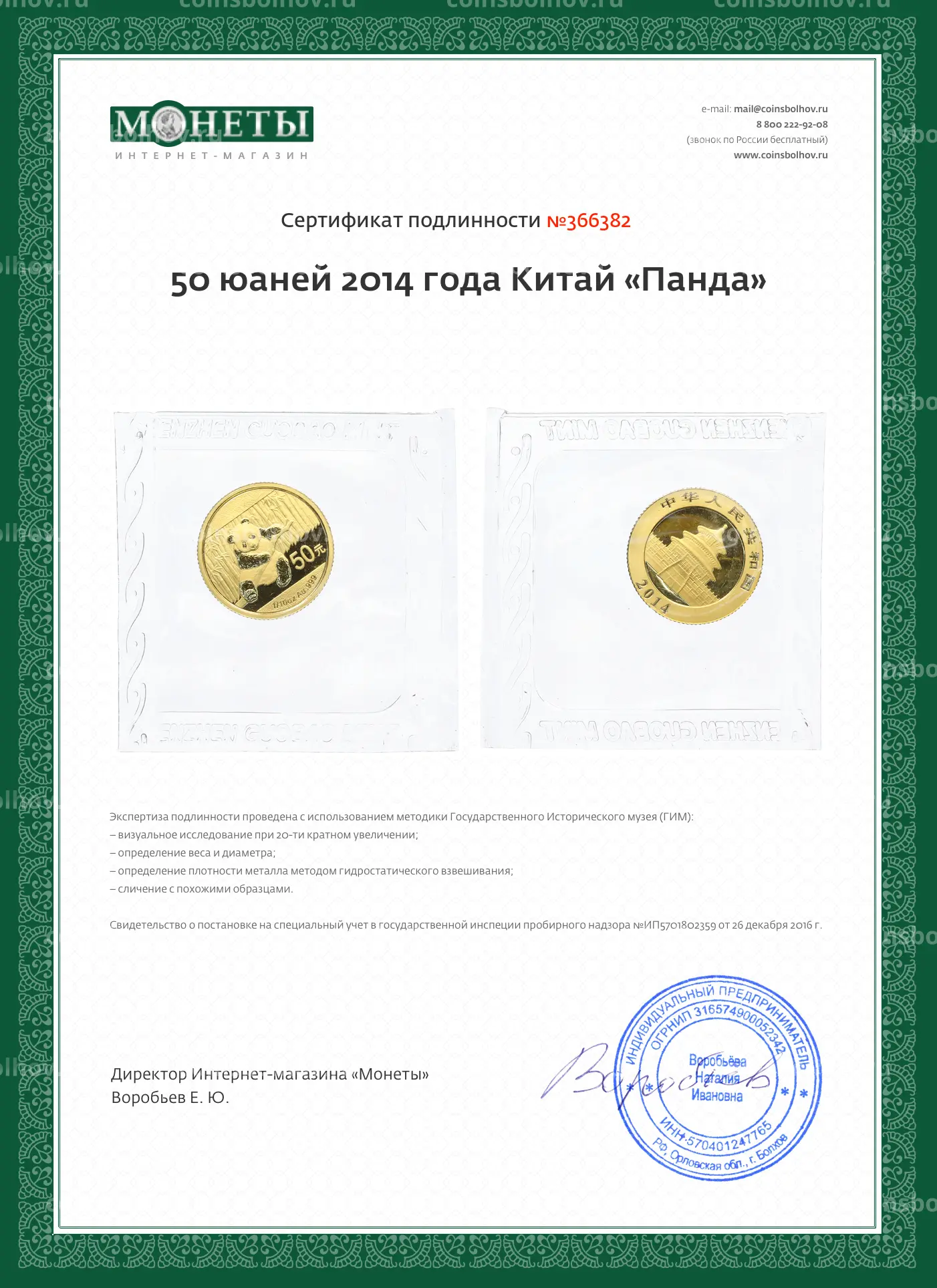 Монета 50 юаней 2014 года Китай «Панда»