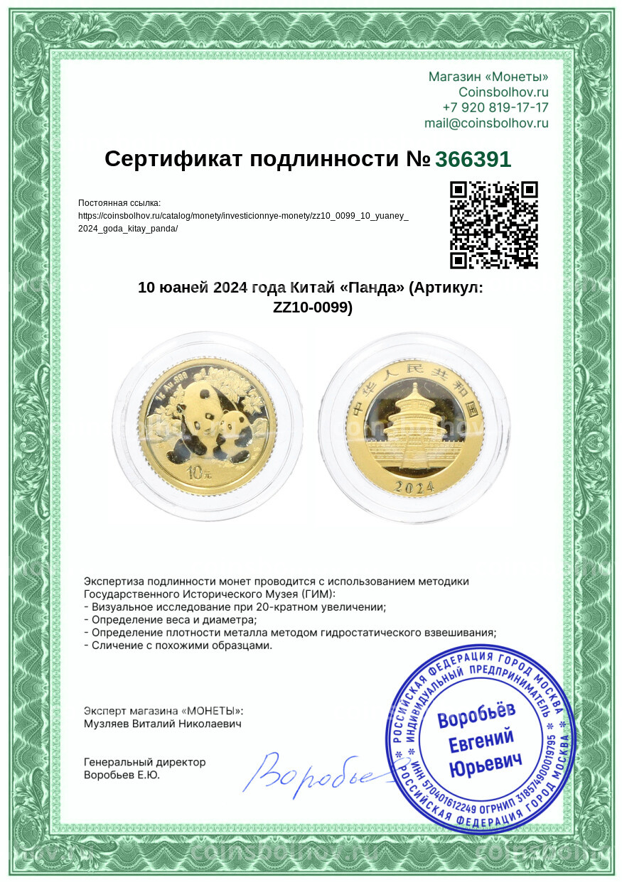 Монета 10 юаней 2024 года Китай «Панда»