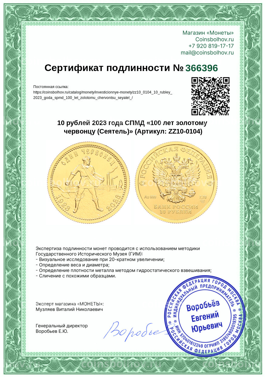 Монета 10 рублей 2023 года СПМД «100 лет золотому червонцу (Сеятель)»