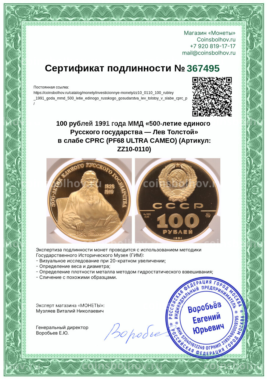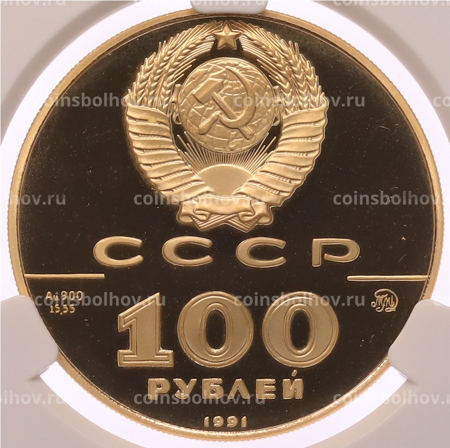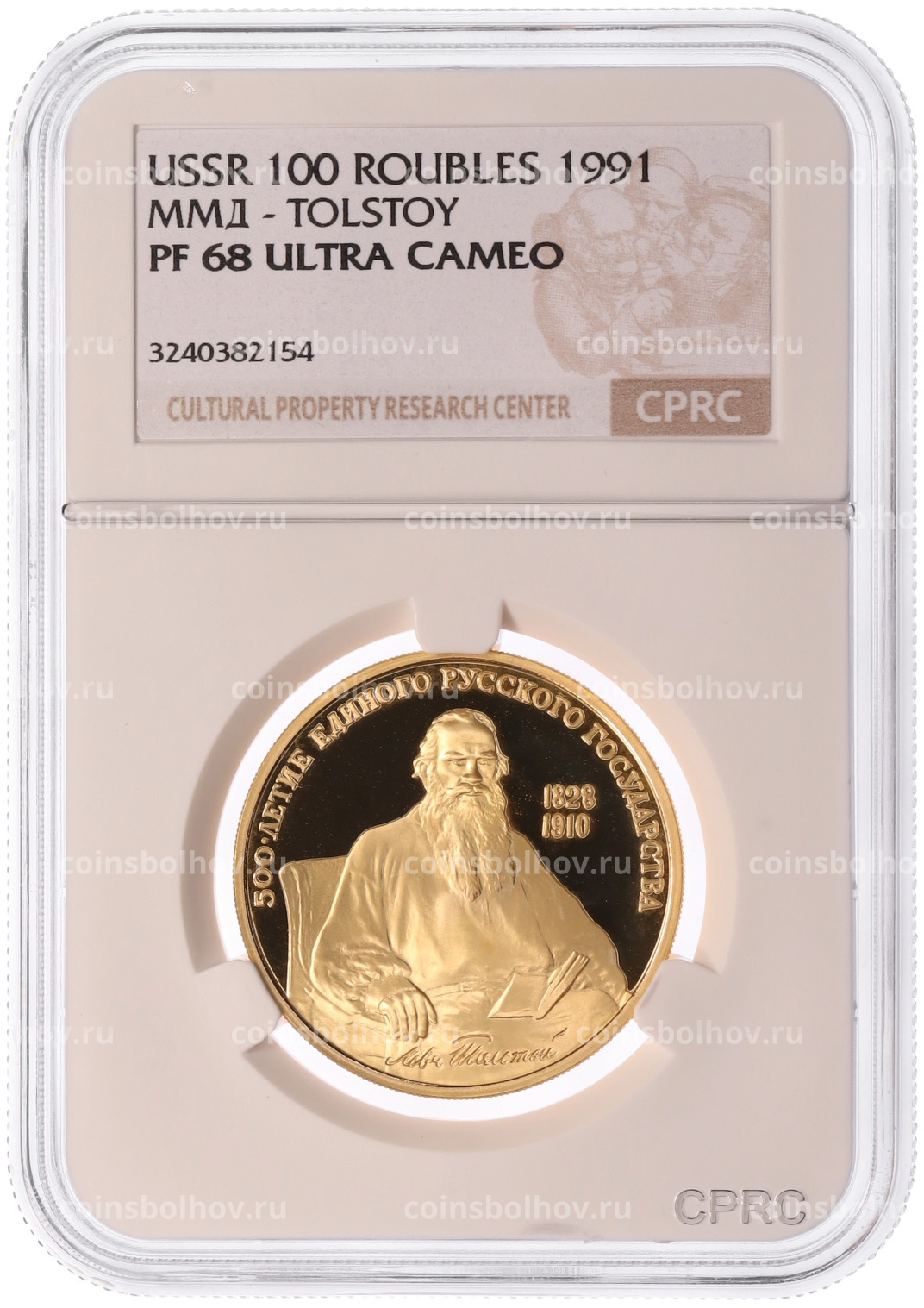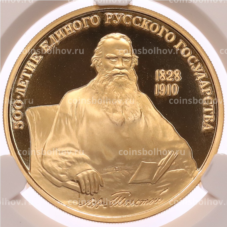 Монета 100 рублей 1991 года ММД «500-летие единого Русского государства — Лев Толстой» в слабе CPRC (PF68 ULTRA CAMEO)