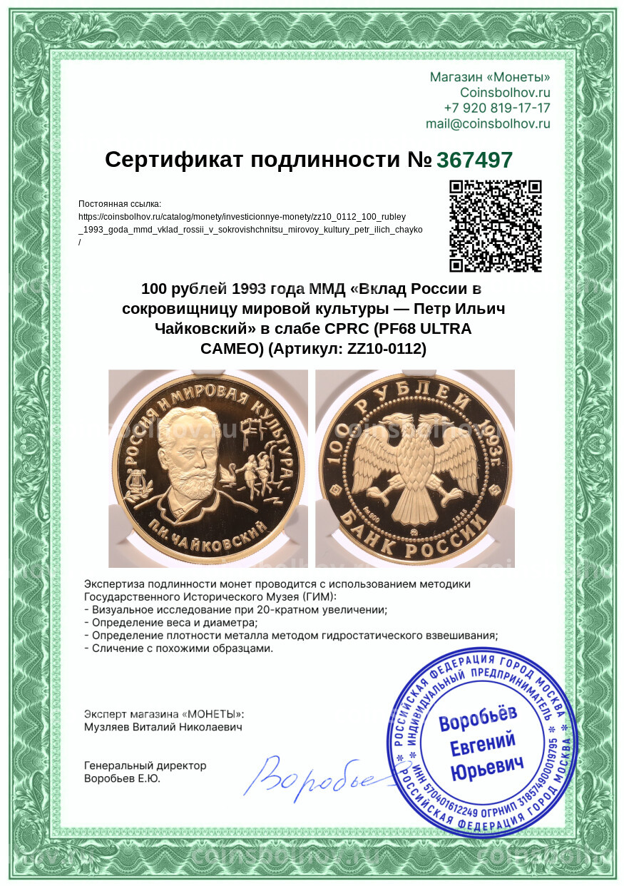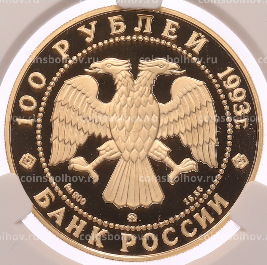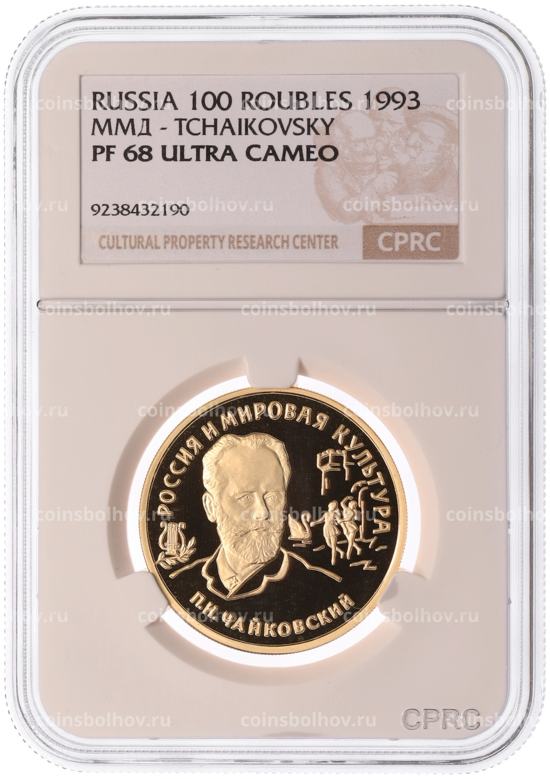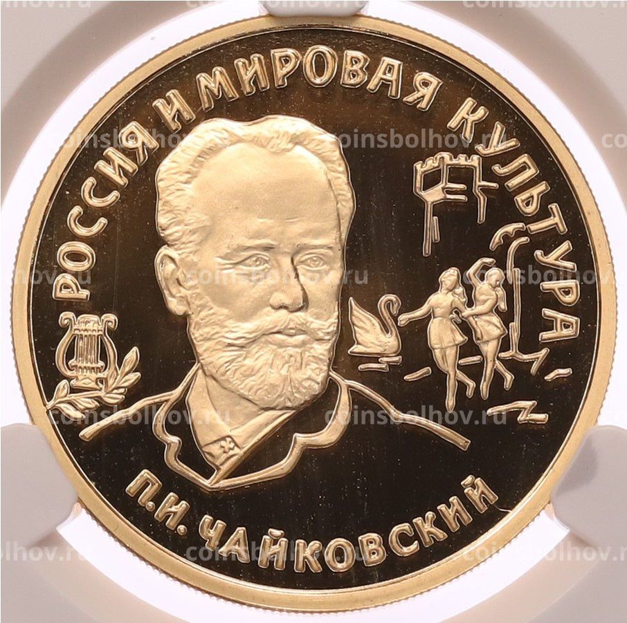 Монета 100 рублей 1993 года ММД «Вклад России в сокровищницу мировой культуры — Петр Ильич Чайковский» в слабе CPRC (PF68 ULTRA CAMEO)