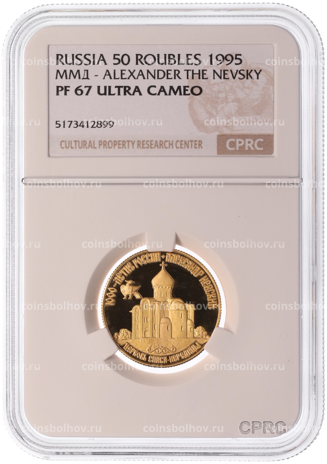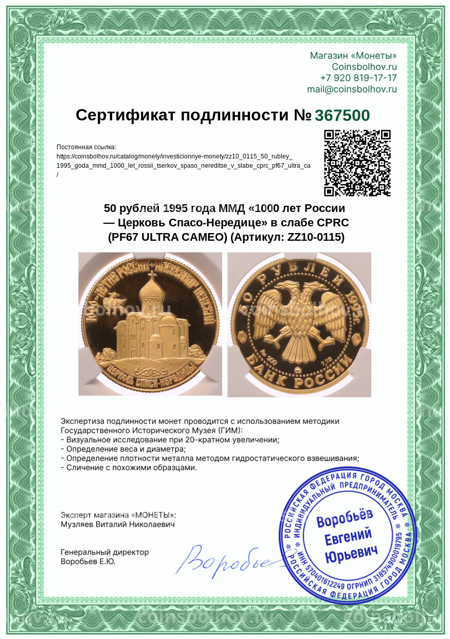 Монета 50 рублей 1995 года ММД «1000 лет России — Церковь Спасо-Нередице» в слабе CPRC (PF67 ULTRA CAMEO)