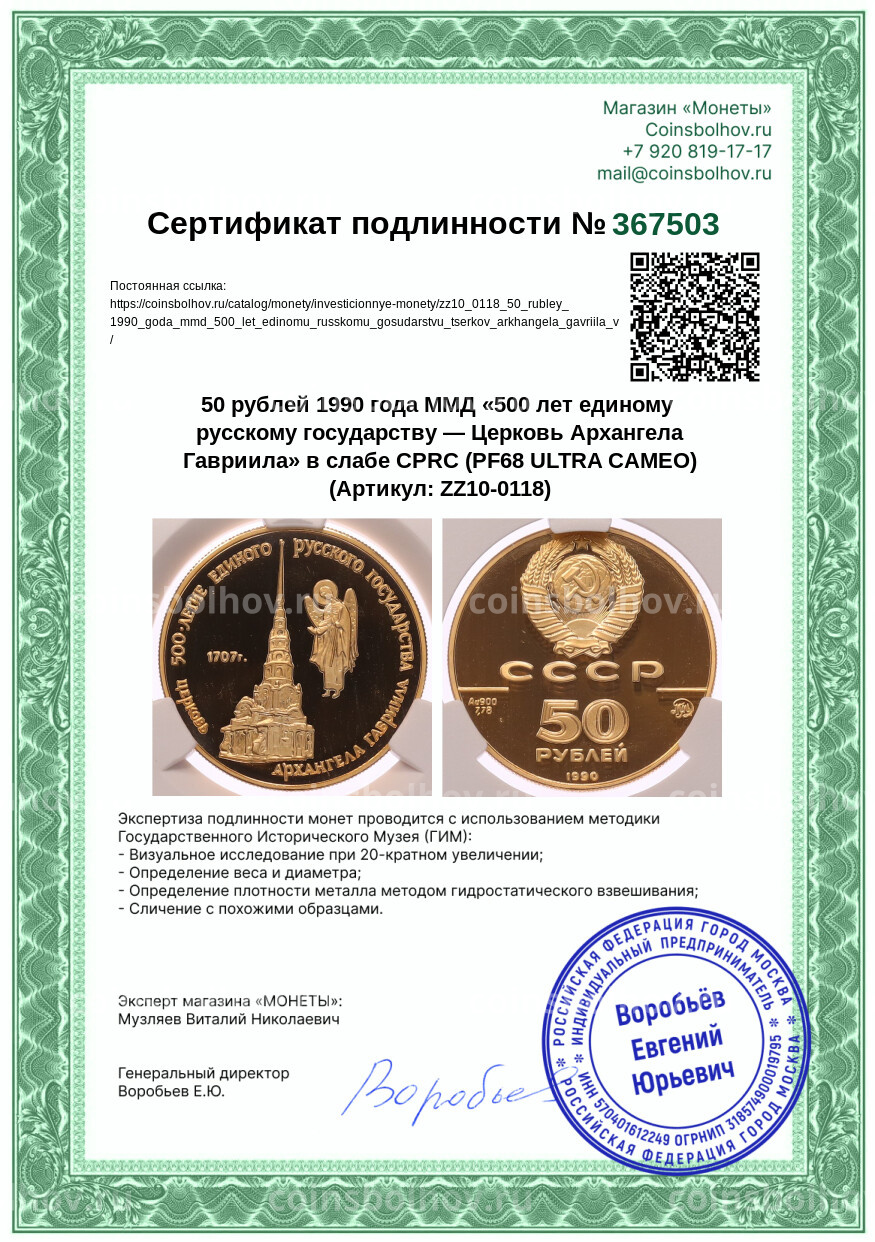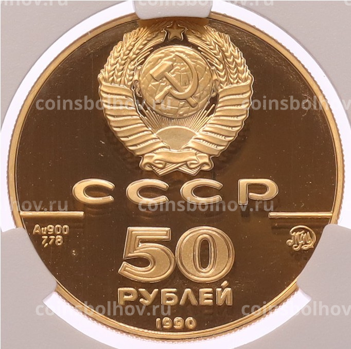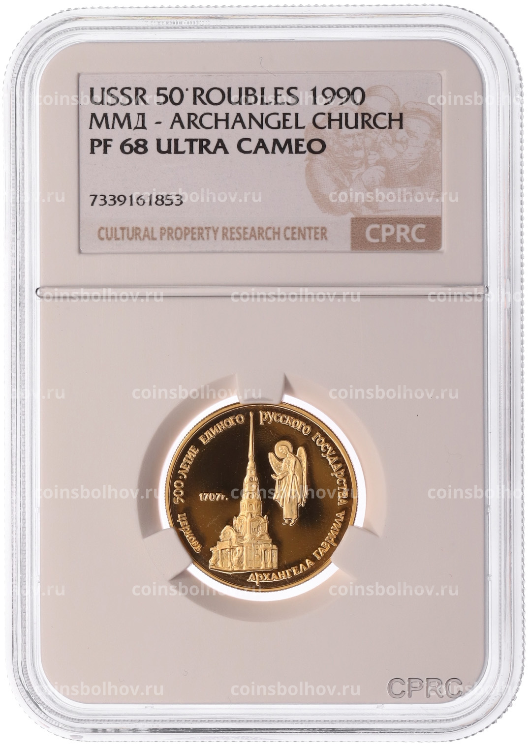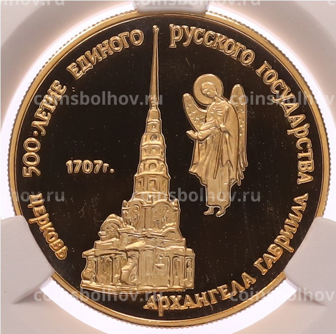 Монета 50 рублей 1990 года ММД «500 лет единому русскому государству — Церковь Архангела Гавриила» в слабе CPRC (PF68 ULTRA CAMEO)