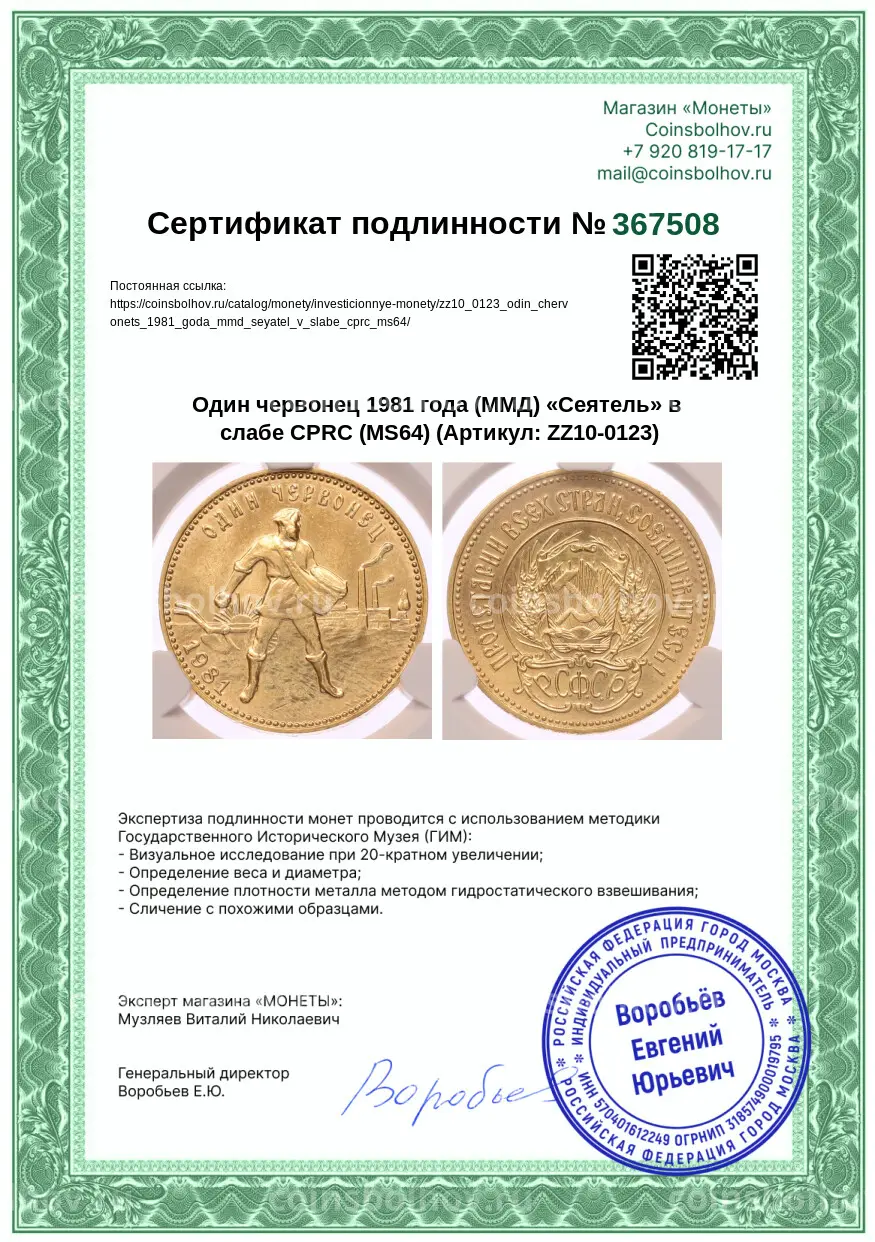 Монета Один червонец 1981 года (ММД) «Сеятель» в слабе CPRC (MS64)