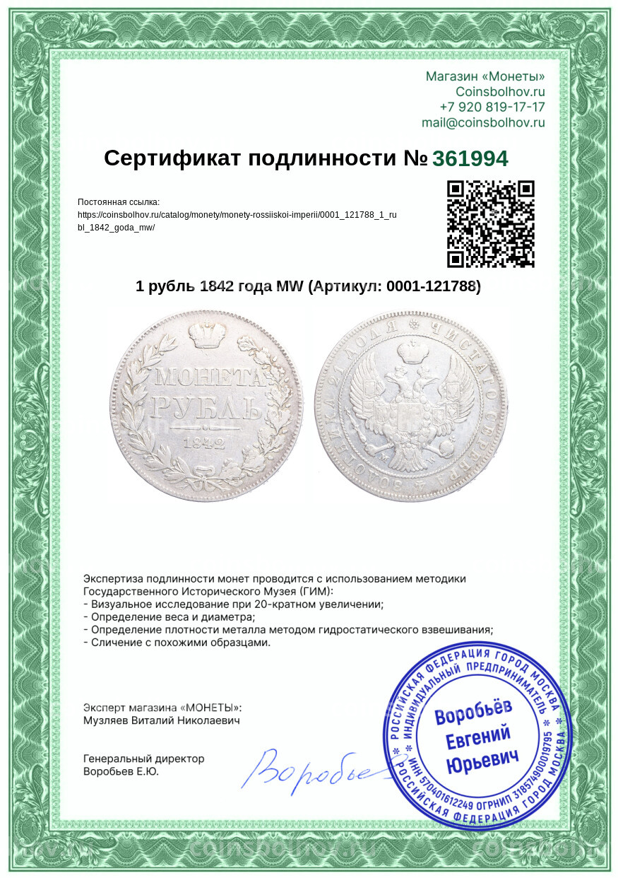 Монета 1 рубль 1842 года MW