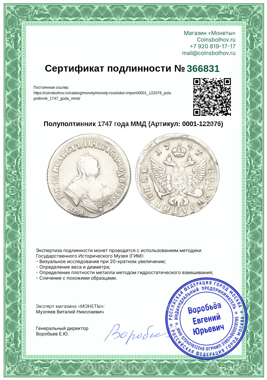 Монета Полуполтинник 1747 года ММД