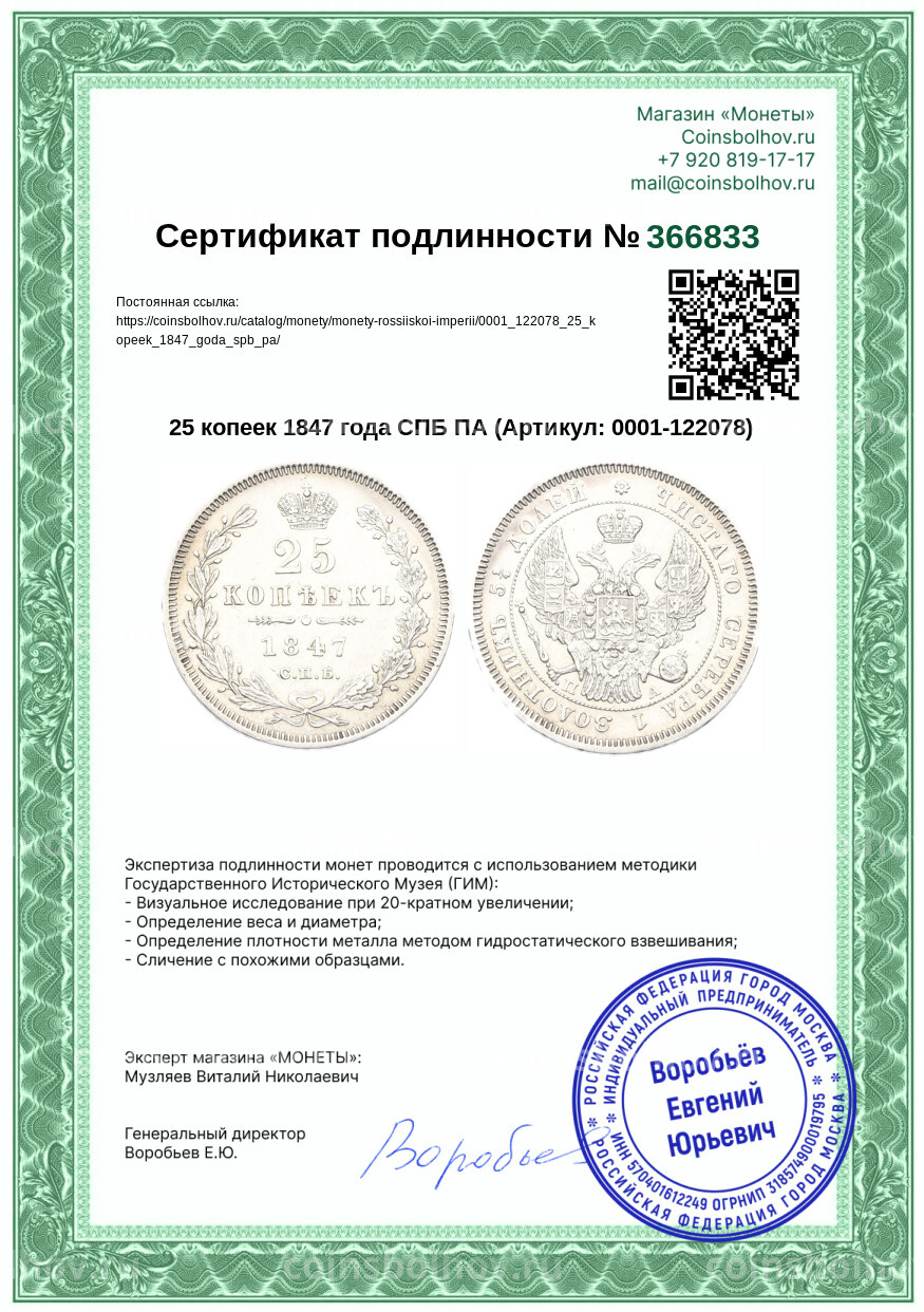 Монета 25 копеек 1847 года СПБ ПА