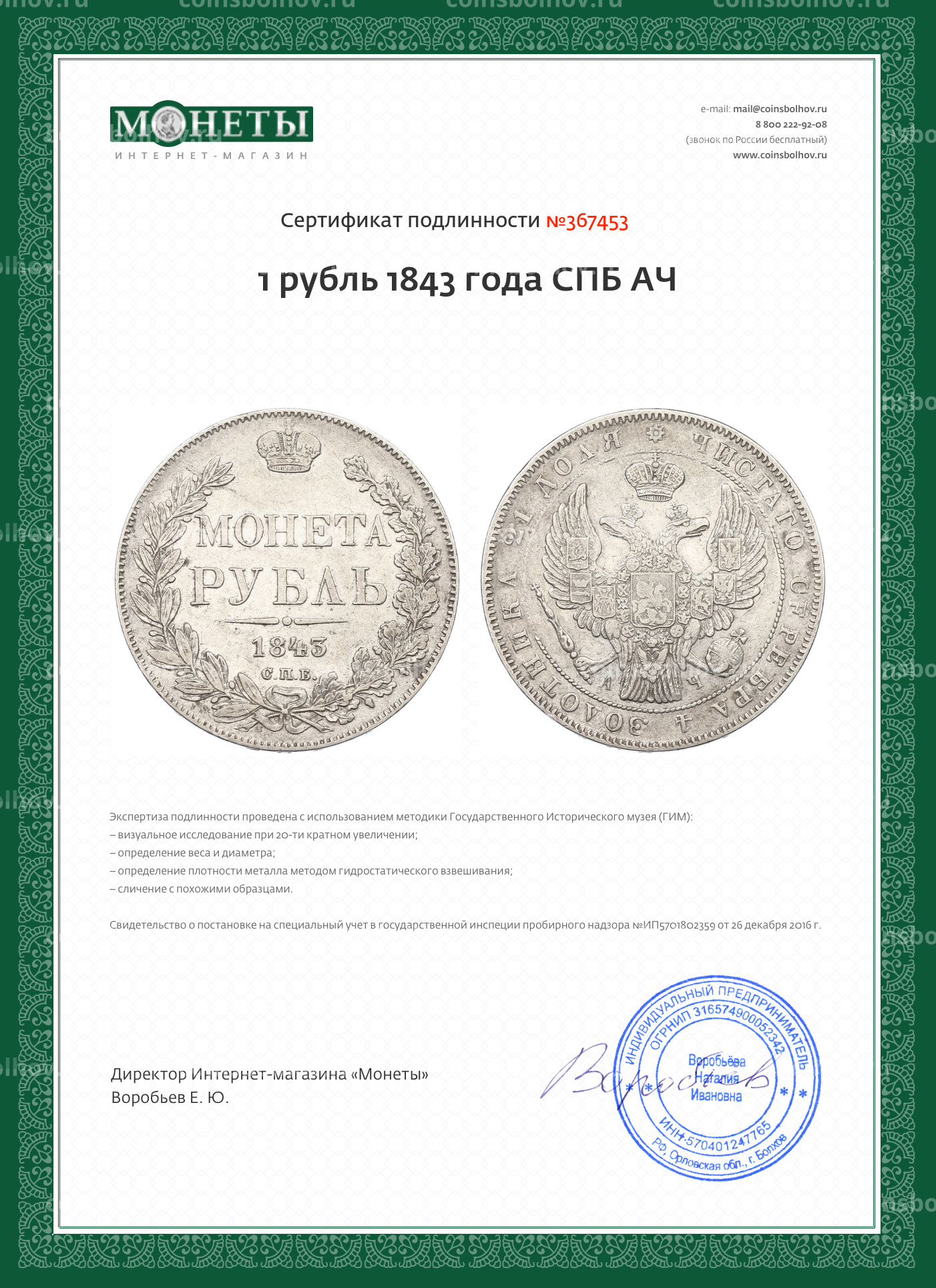 Монета 1 рубль 1843 года СПБ АЧ