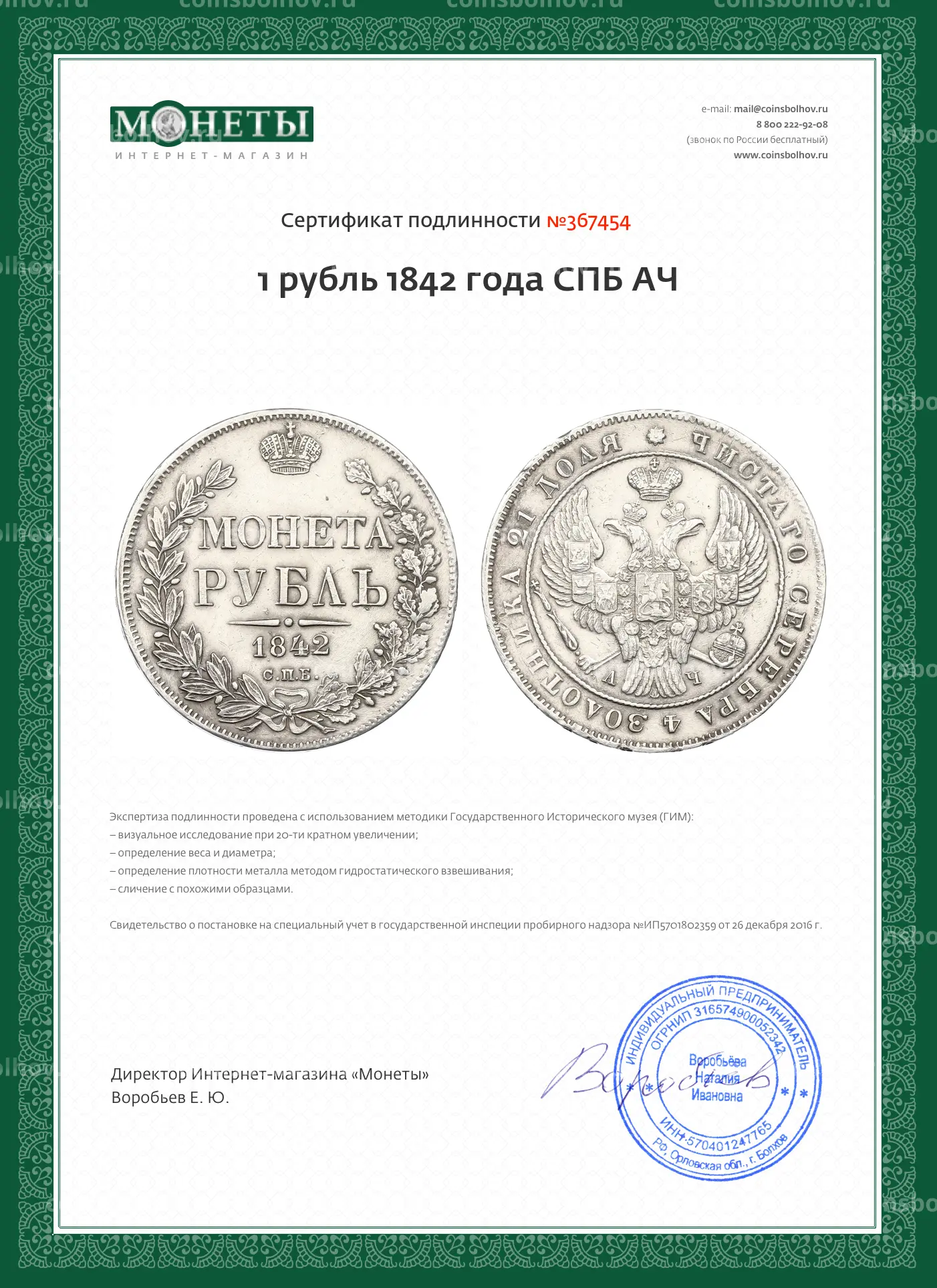 Монета 1 рубль 1842 года СПБ АЧ