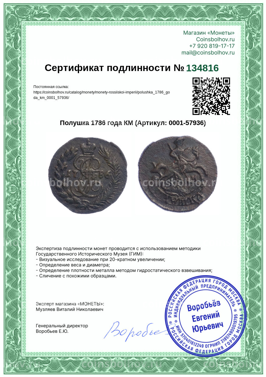 Монета Полушка 1786 года КМ