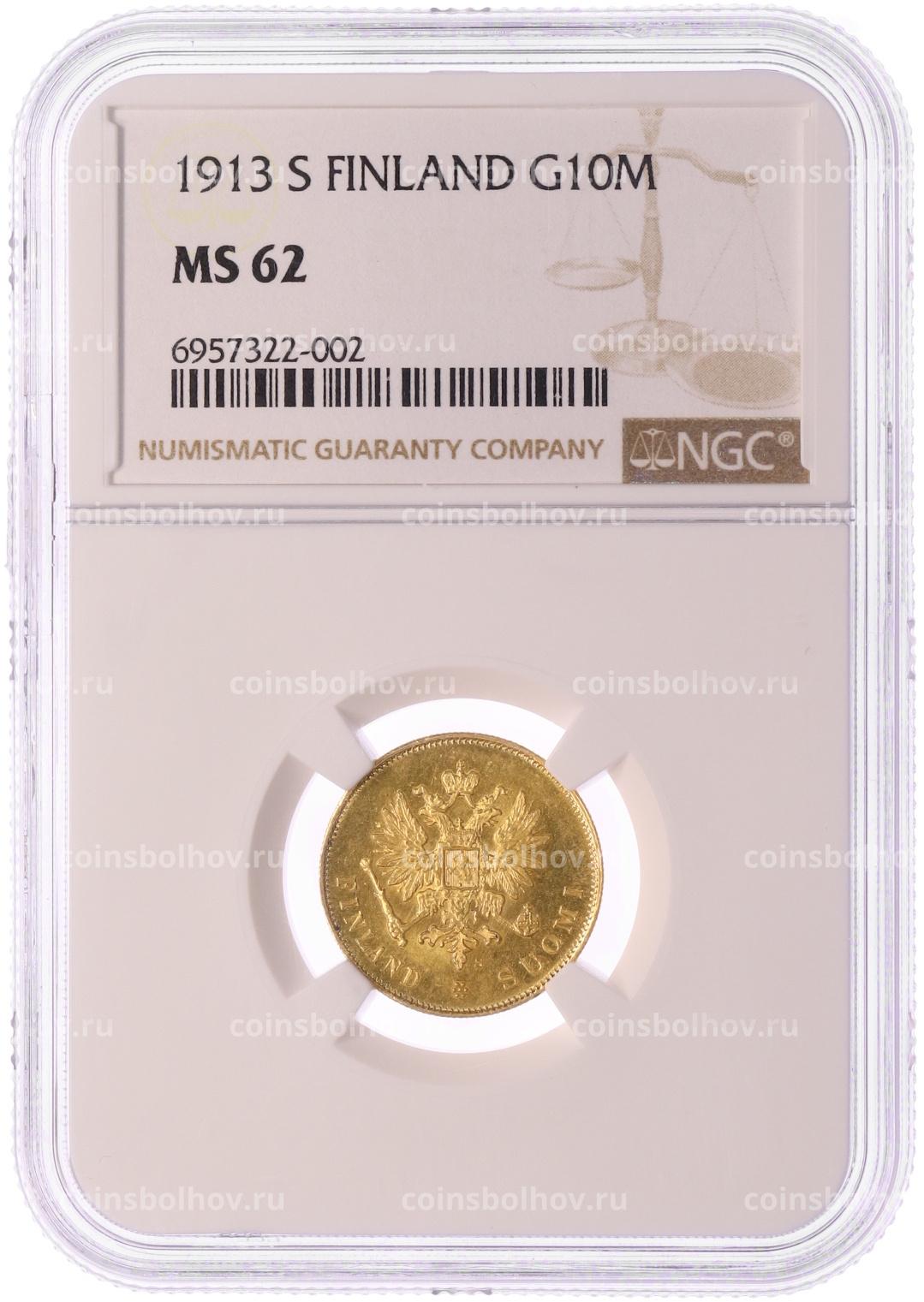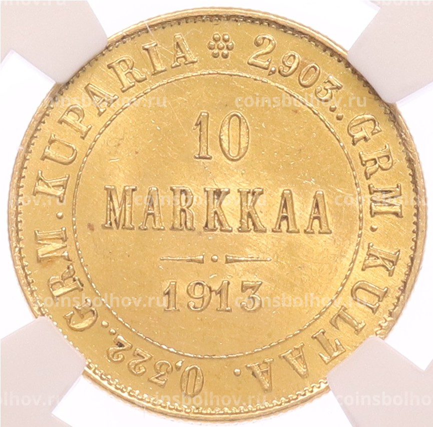 Монета 10 марок 1913 года Русская Финляндия — в слабе NGC (MS62)