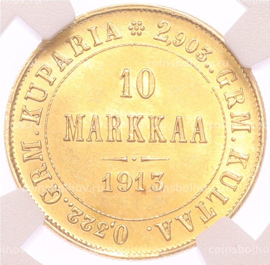 Монета 10 марок 1913 года Русская Финляндия — в слабе NGC (MS62)