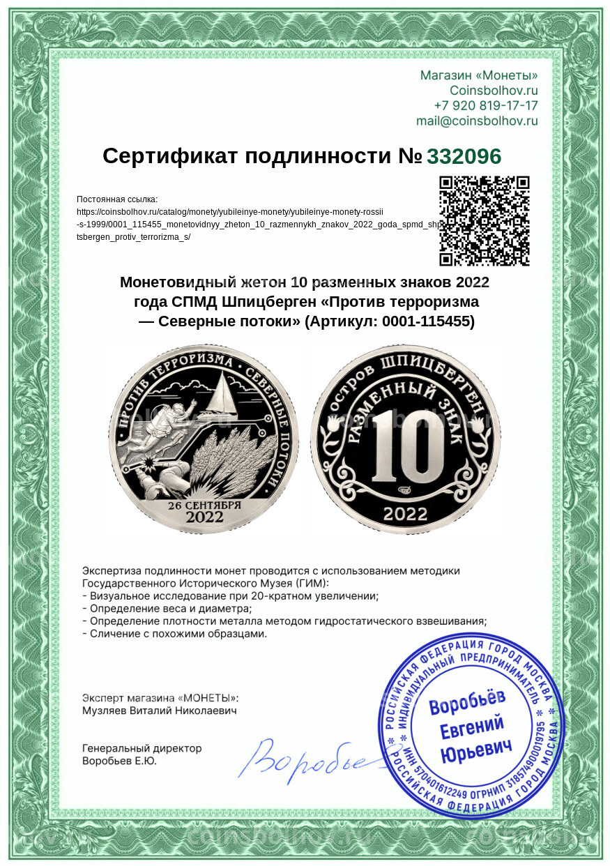 Монета Монетовидный жетон 10 разменных знаков 2022 года СПМД Шпицберген «Против терроризма — Северные потоки»