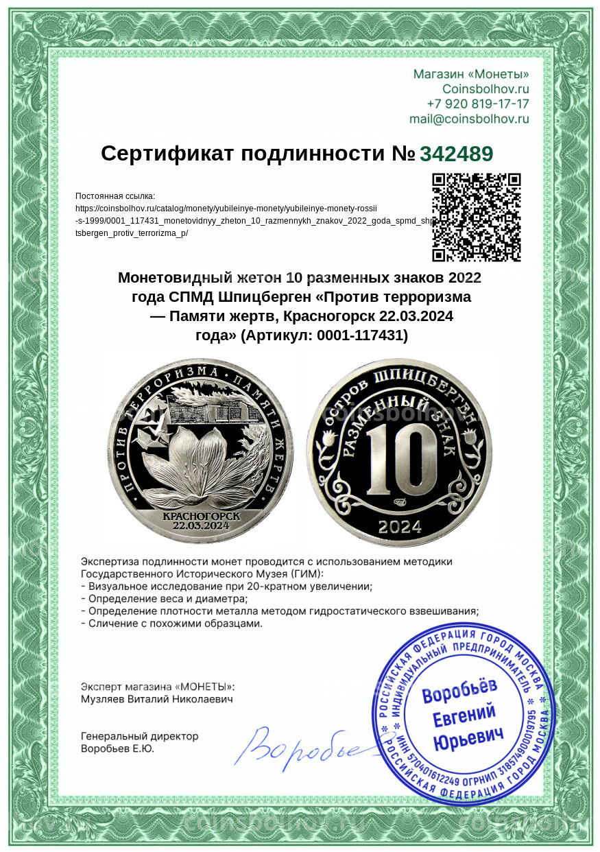 Монета Монетовидный жетон 10 разменных знаков 2022 года СПМД Шпицберген «Против терроризма — Памяти жертв, Красногорск 22.03.2024 года»