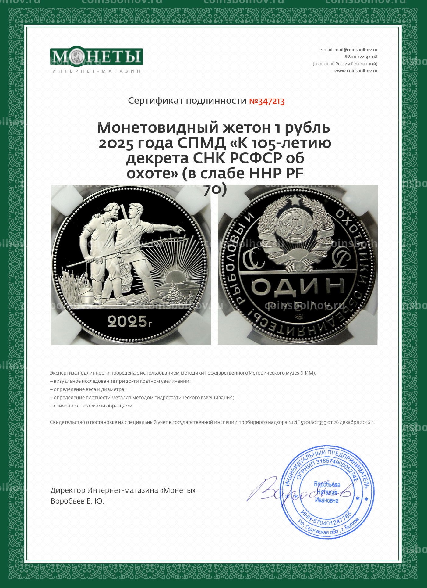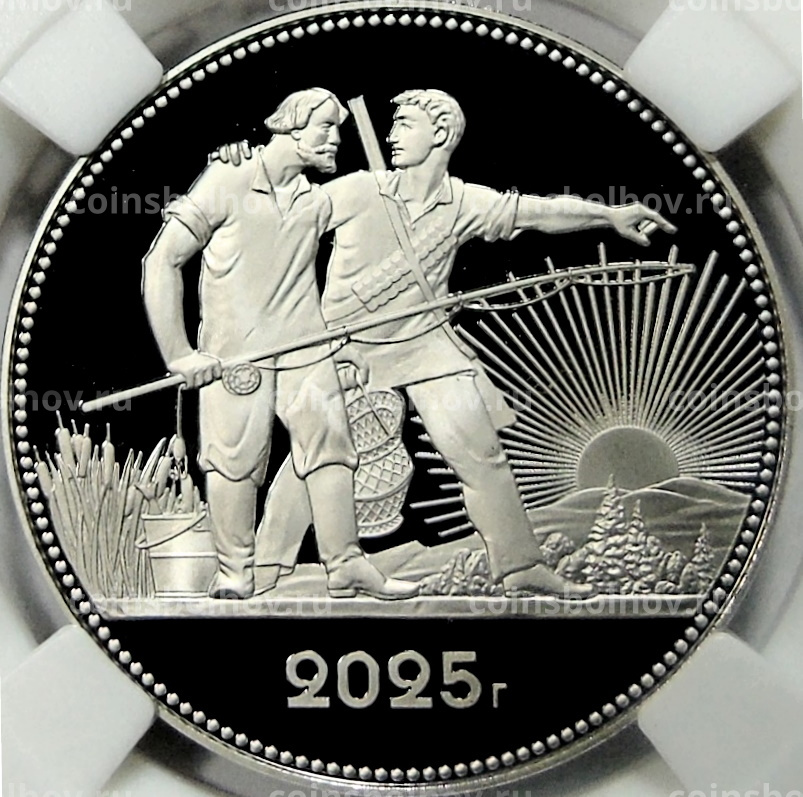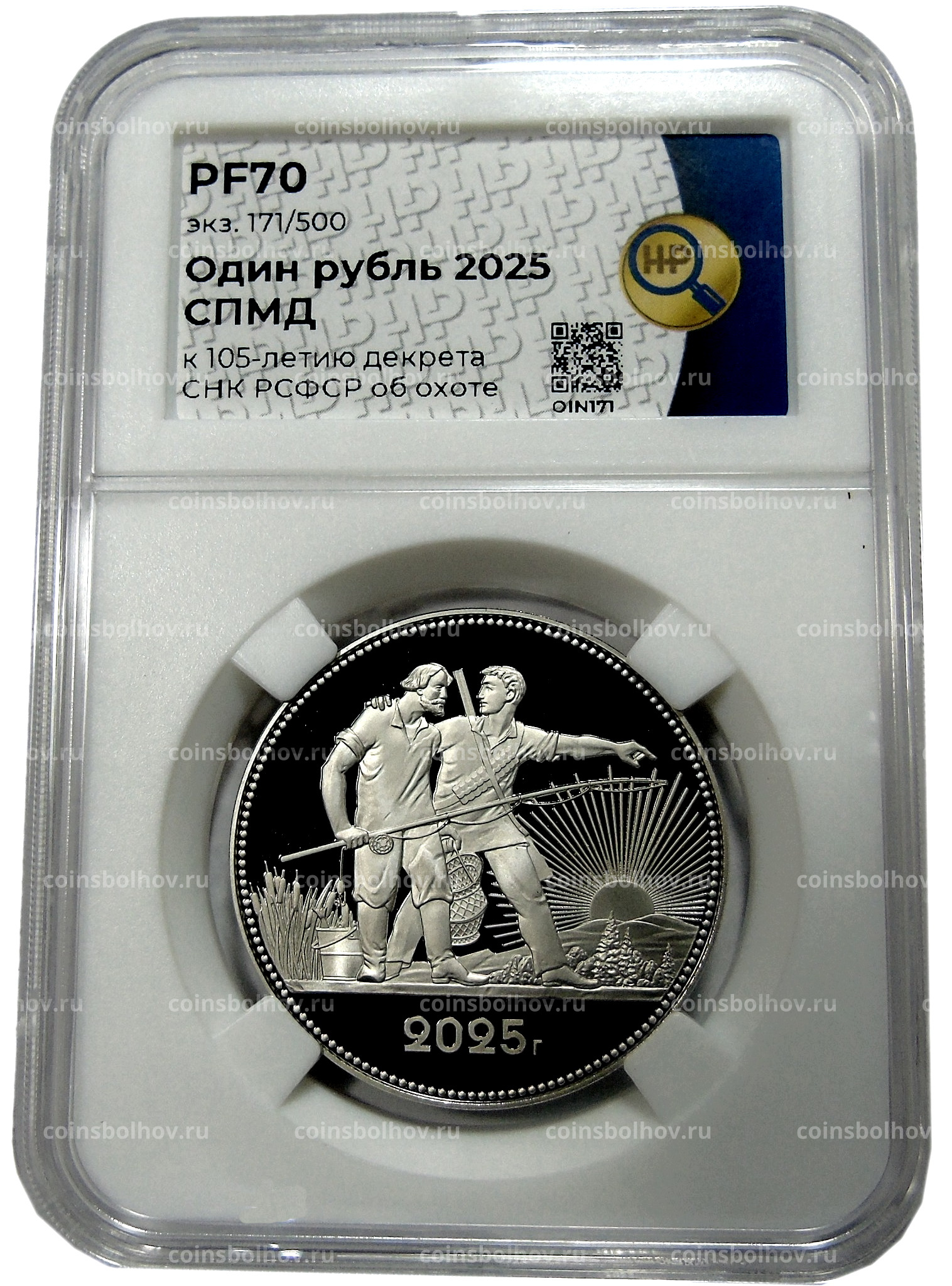 Монетовидный жетон 1 рубль 2025 года СПМД «К 105-летию декрета СНК РСФСР об охоте» (в слабе ННР PF 70)