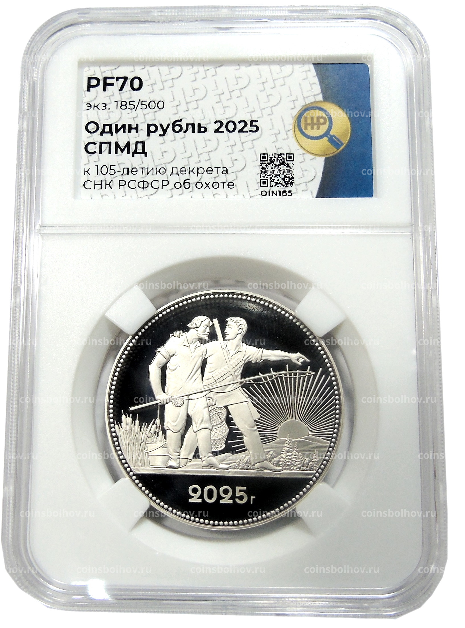 Монетовидный жетон 1 рубль 2025 года СПМД «К 105-летию декрета СНК РСФСР об охоте» (в слабе ННР PF70)