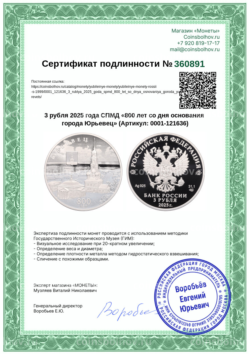 Монета 3 рубля 2025 года СПМД «800 лет со дня основания города Юрьевец»