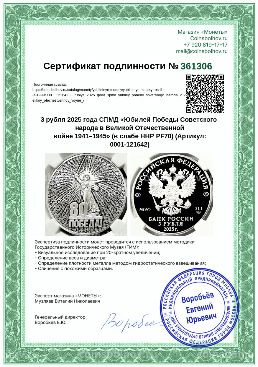 Монета 3 рубля 2025 года СПМД «Юбилей Победы Советского народа в Великой Отечественной войне 1941–1945» (в слабе ННР PF70)
