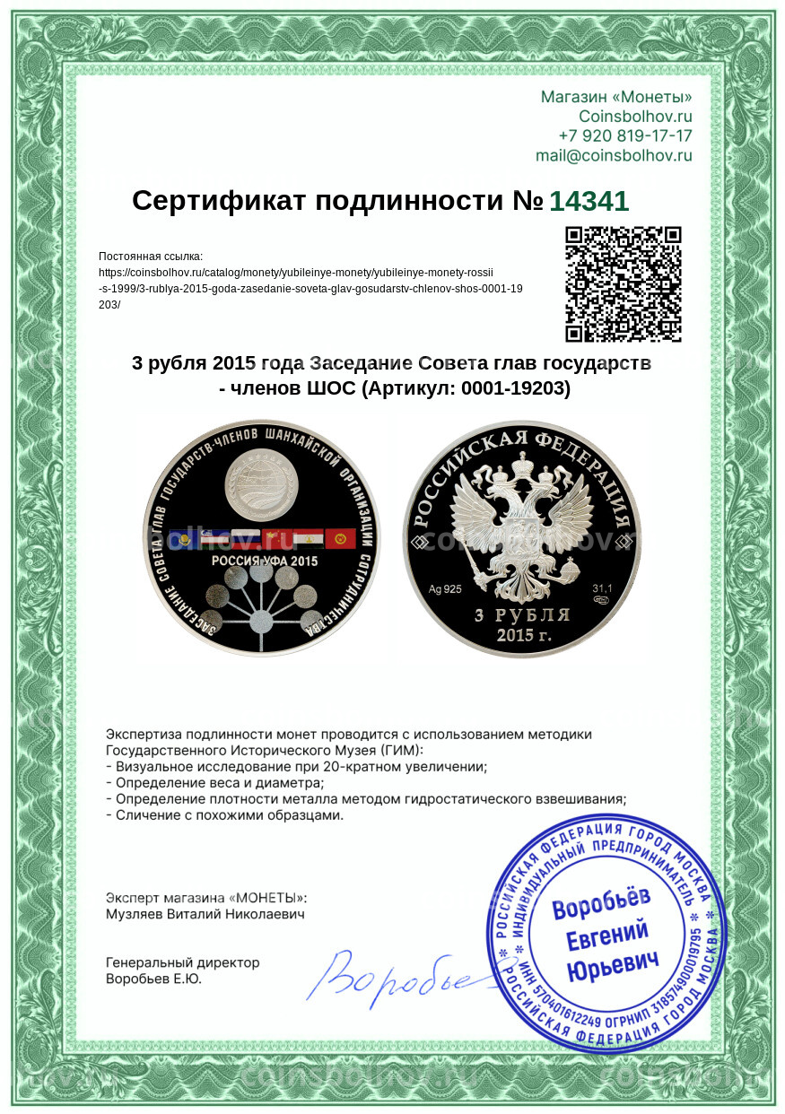 Монета 3 рубля 2015 года Заседание Совета глав государств - членов ШОС
