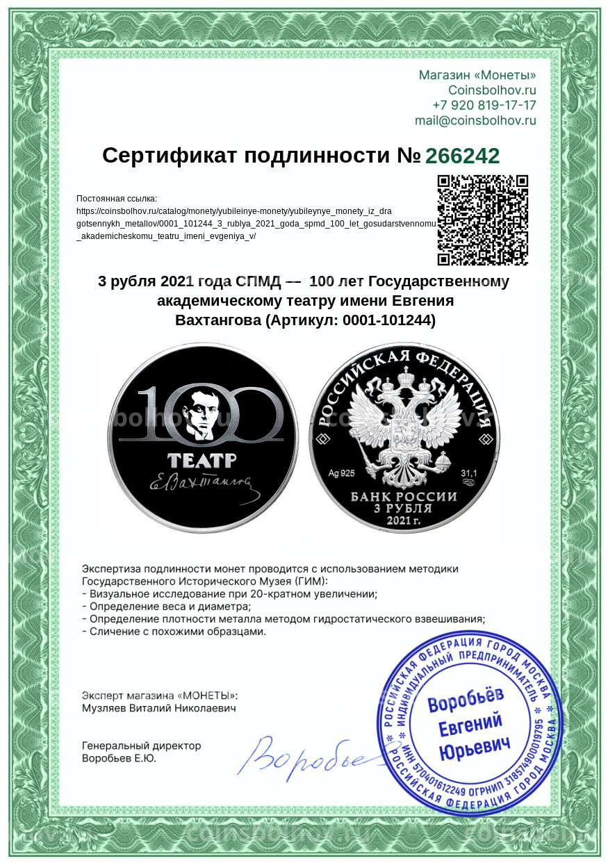 Монета 3 рубля 2021 года СПМД — 100 лет Государственному академическому театру имени Евгения Вахтангова