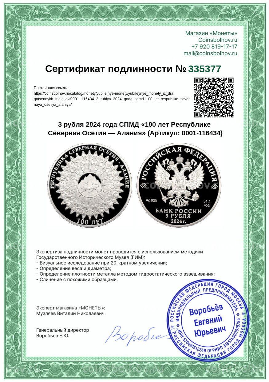 Монета 3 рубля 2024 года СПМД «100 лет Республике Северная Осетия — Алания»