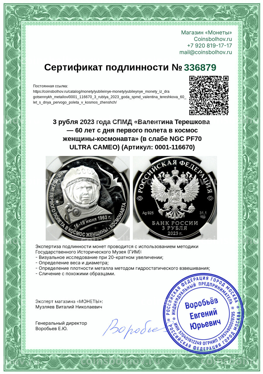 Монета 3 рубля 2023 года СПМД «Валентина Терешкова — 60 лет с дня первого полета в космос женщины-космонавта» (в слабе NGC PF70 ULTRA CAMEO)