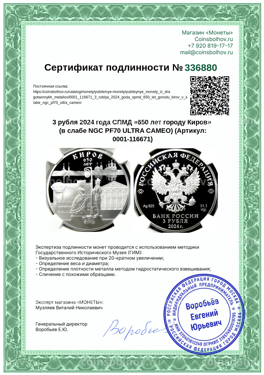 Монета 3 рубля 2024 года СПМД «650 лет городу Киров» (в слабе NGC PF70 ULTRA CAMEO)