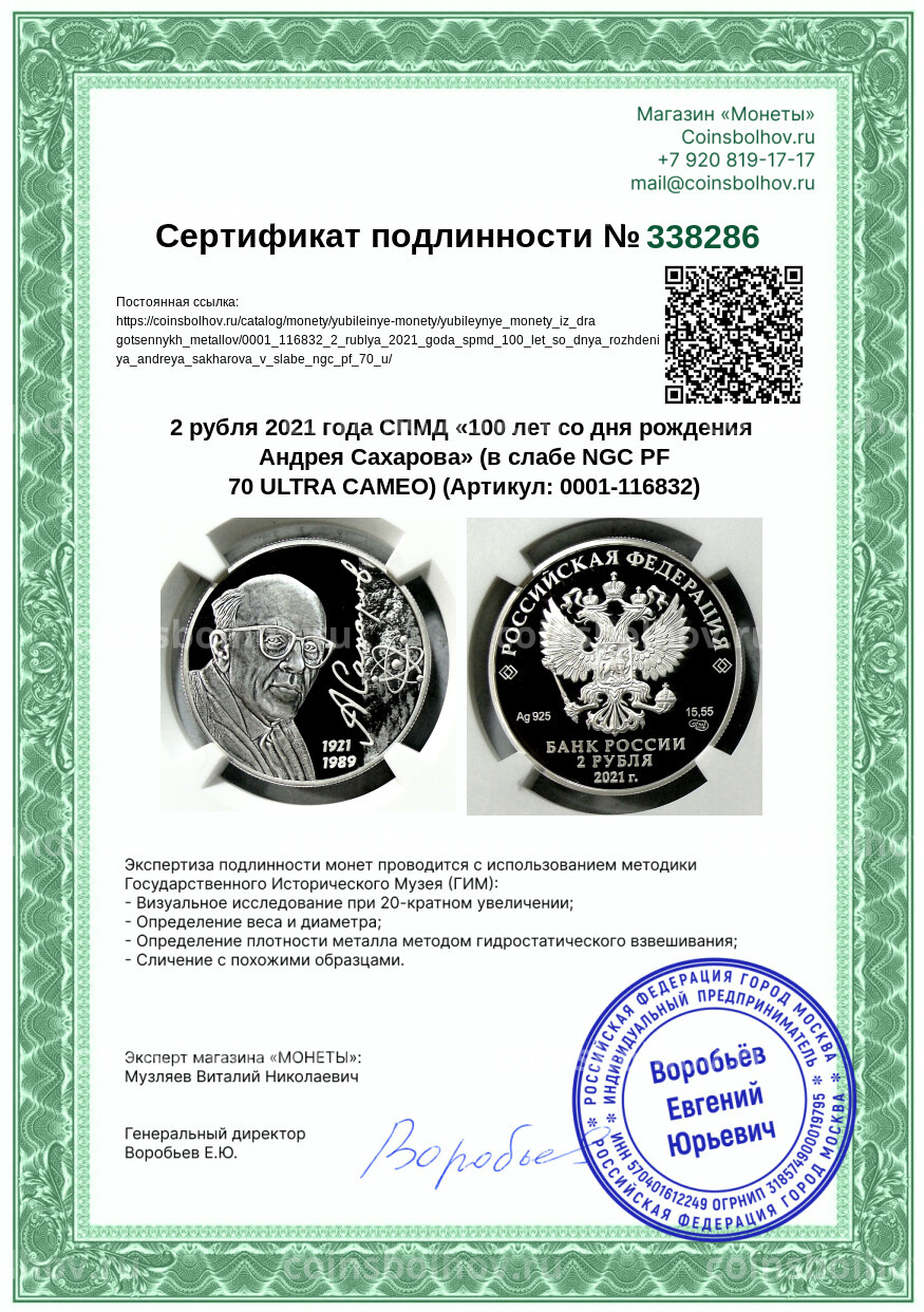 Монета 2 рубля 2021 года СПМД «100 лет со дня рождения Андрея Сахарова» (в слабе NGC PF 70 ULTRA CAMEO)