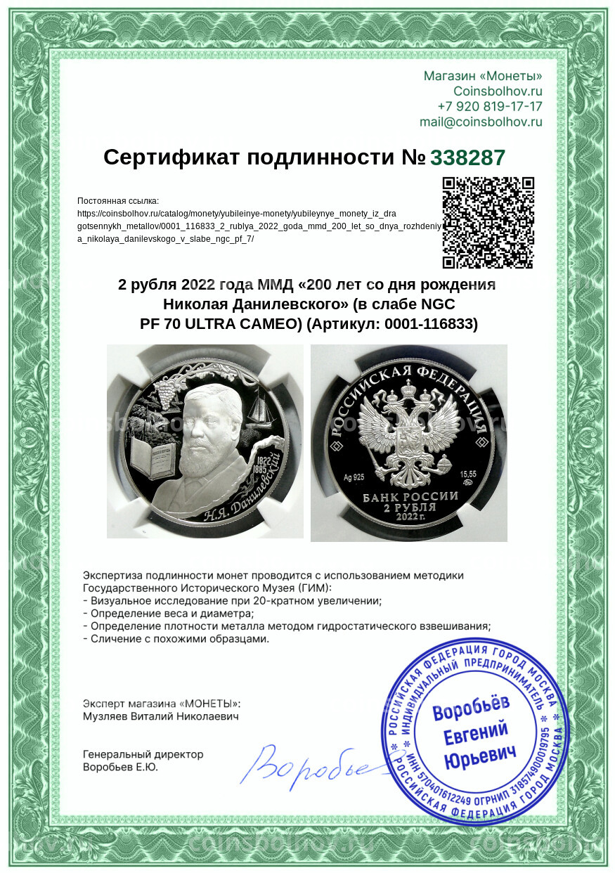 Монета 2 рубля 2022 года ММД «200 лет со дня рождения Николая Данилевского» (в слабе NGC PF 70 ULTRA CAMEO)