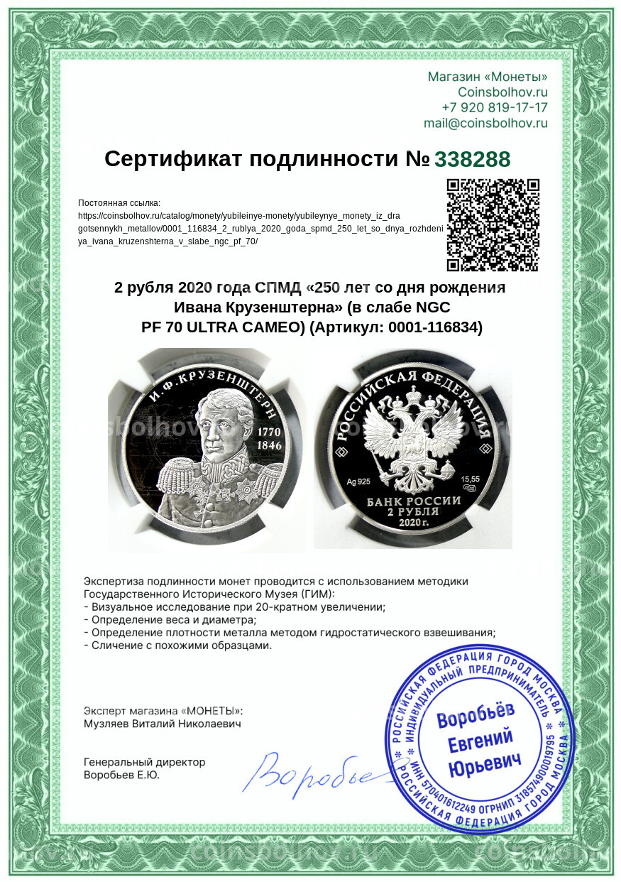 Монета 2 рубля 2020 года СПМД «250 лет со дня рождения Ивана Крузенштерна» (в слабе NGC PF 70 ULTRA CAMEO)