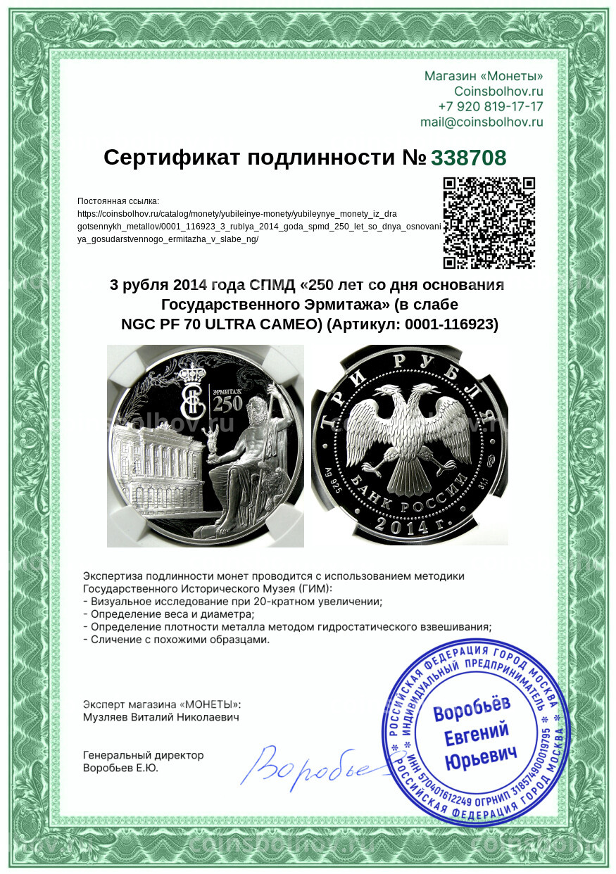 Монета 3 рубля 2014 года СПМД «250 лет со дня основания Государственного Эрмитажа» (в слабе NGC PF 70 ULTRA CAMEO)