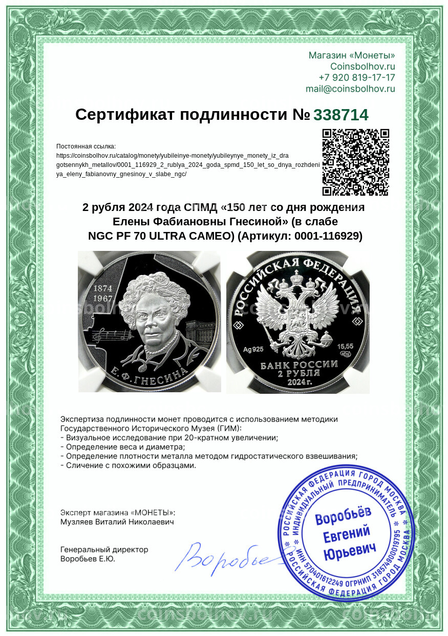 Монета 2 рубля 2024 года СПМД «150 лет со дня рождения Елены Фабиановны Гнесиной» (в слабе NGC PF 70 ULTRA CAMEO)