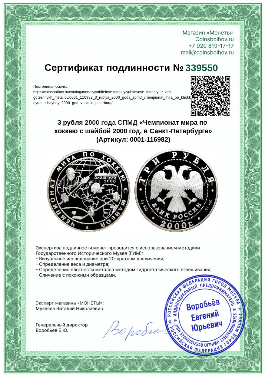 Монета 3 рубля 2000 года СПМД «Чемпионат мира по хоккею c шайбой 2000 год, в Санкт-Петербурге»