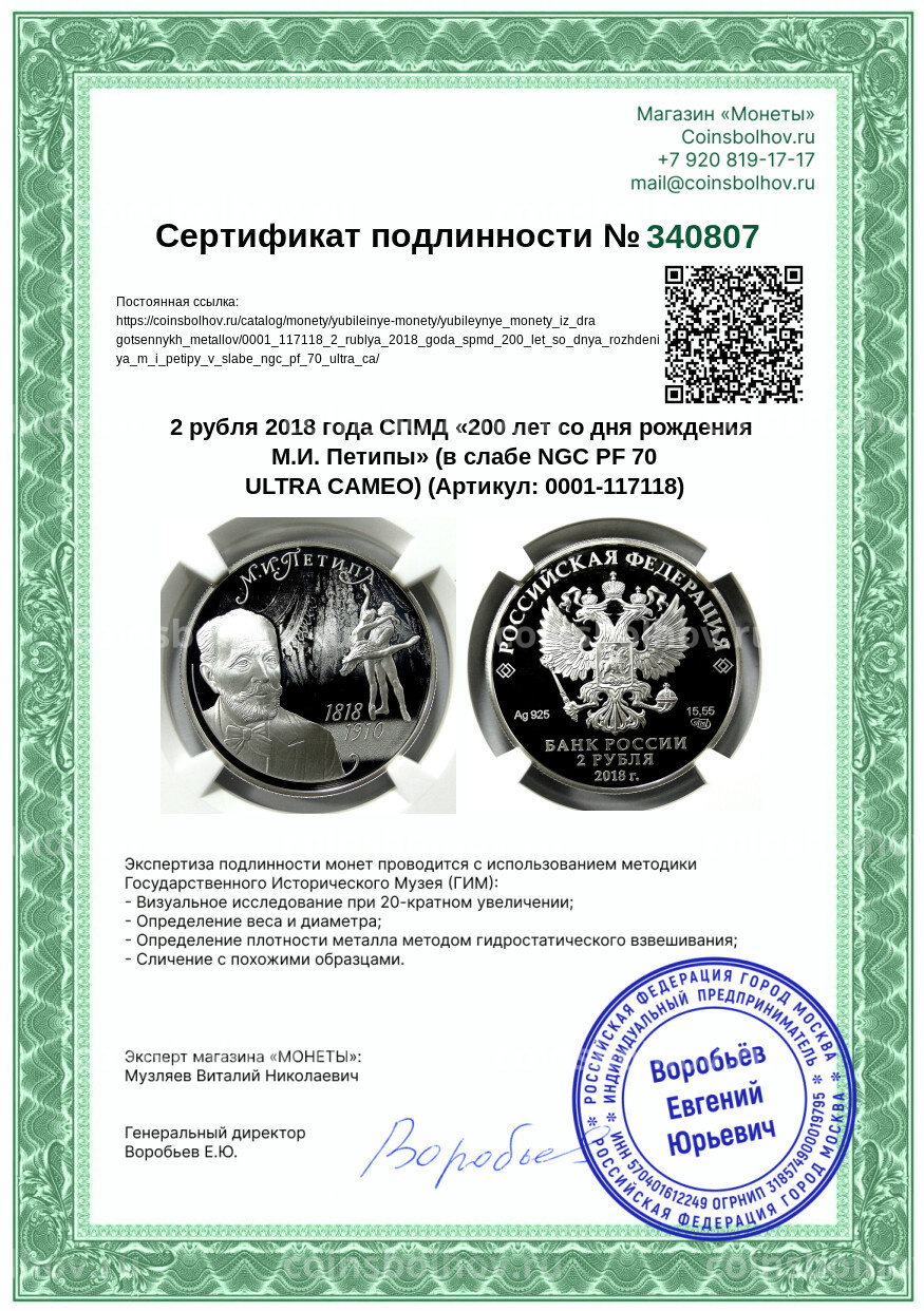 Монета 2 рубля 2018 года СПМД «200 лет со дня рождения М.И. Петипы» (в слабе NGC PF 70 ULTRA CAMEO)