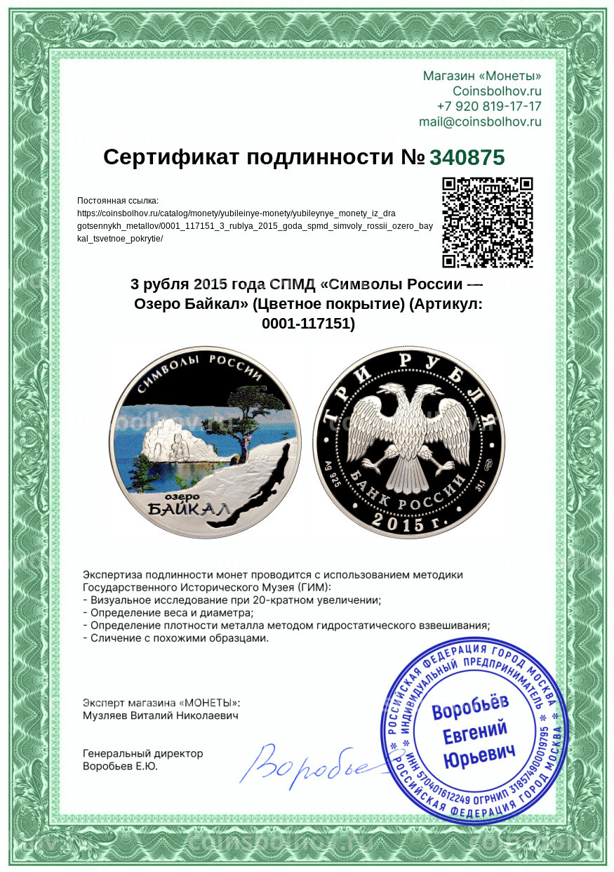 Монета 3 рубля 2015 года СПМД «Символы России — Озеро Байкал» (Цветное покрытие)