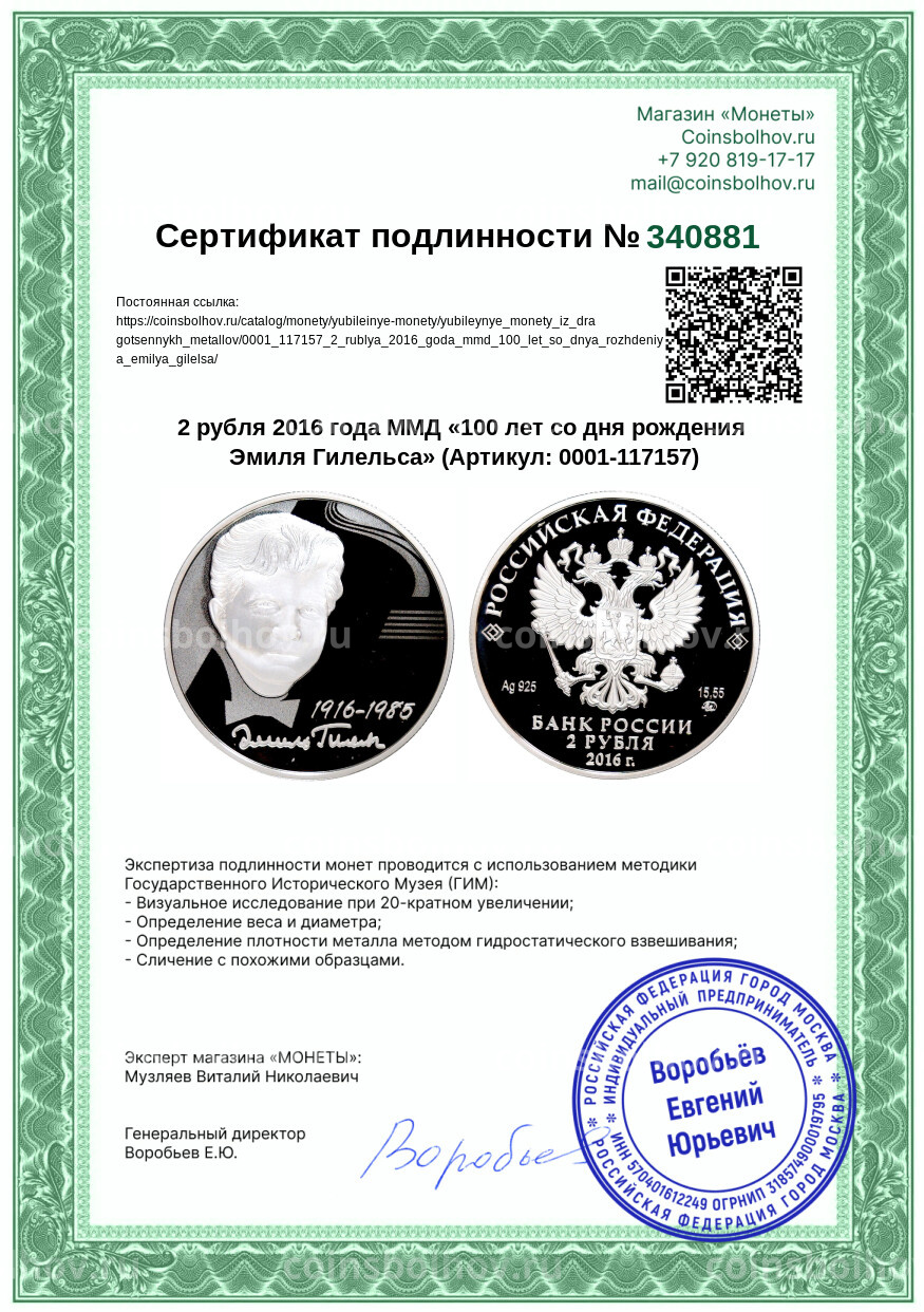 Монета 2 рубля 2016 года ММД «100 лет со дня рождения Эмиля Гилельса»