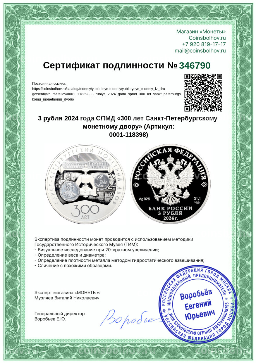 Монета 3 рубля 2024 года СПМД «300 лет Санкт-Петербургскому монетному двору»