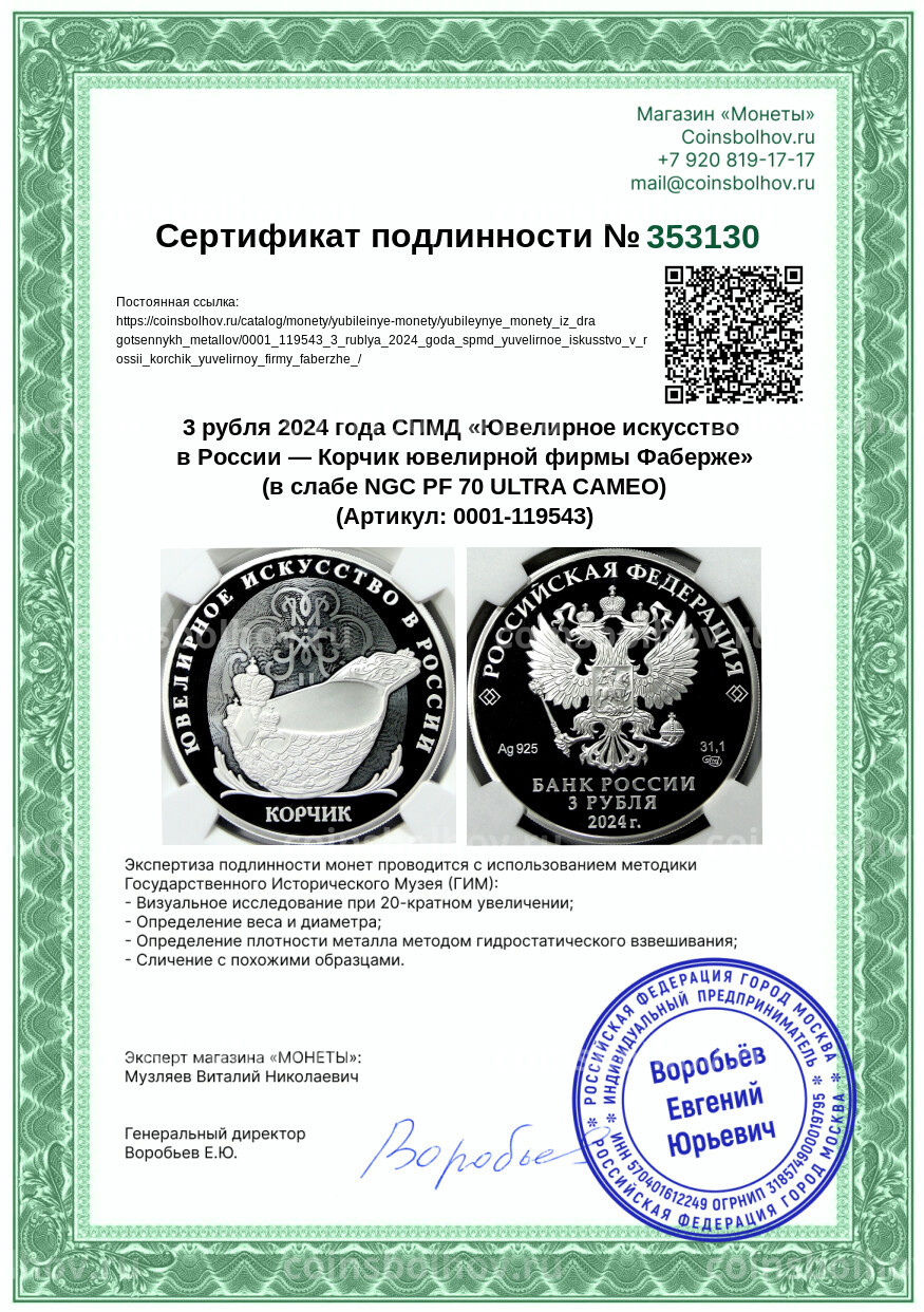 Монета 3 рубля 2024 года СПМД «Ювелирное искусство в России — Корчик ювелирной фирмы Фаберже» (в слабе NGC PF 70 ULTRA CAMEO)