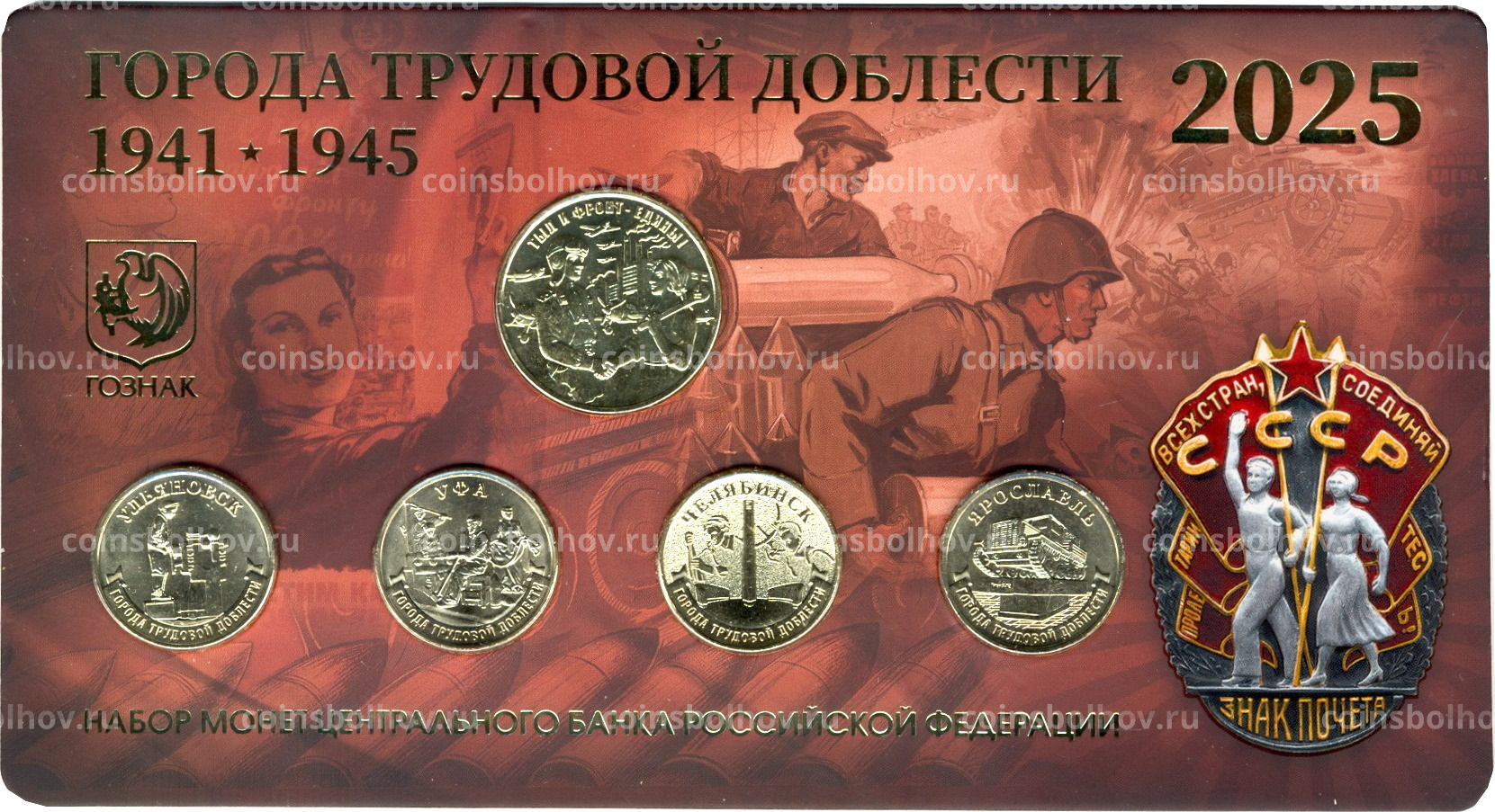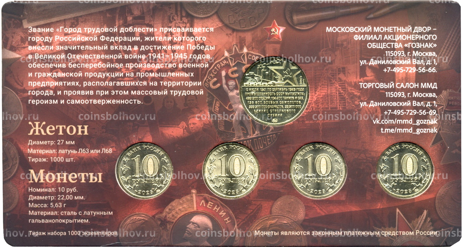 Набор из 4 монет «Города трудовой доблести» + жетон «Тыл и фронт едины» 2025 года ММД (в блистере)