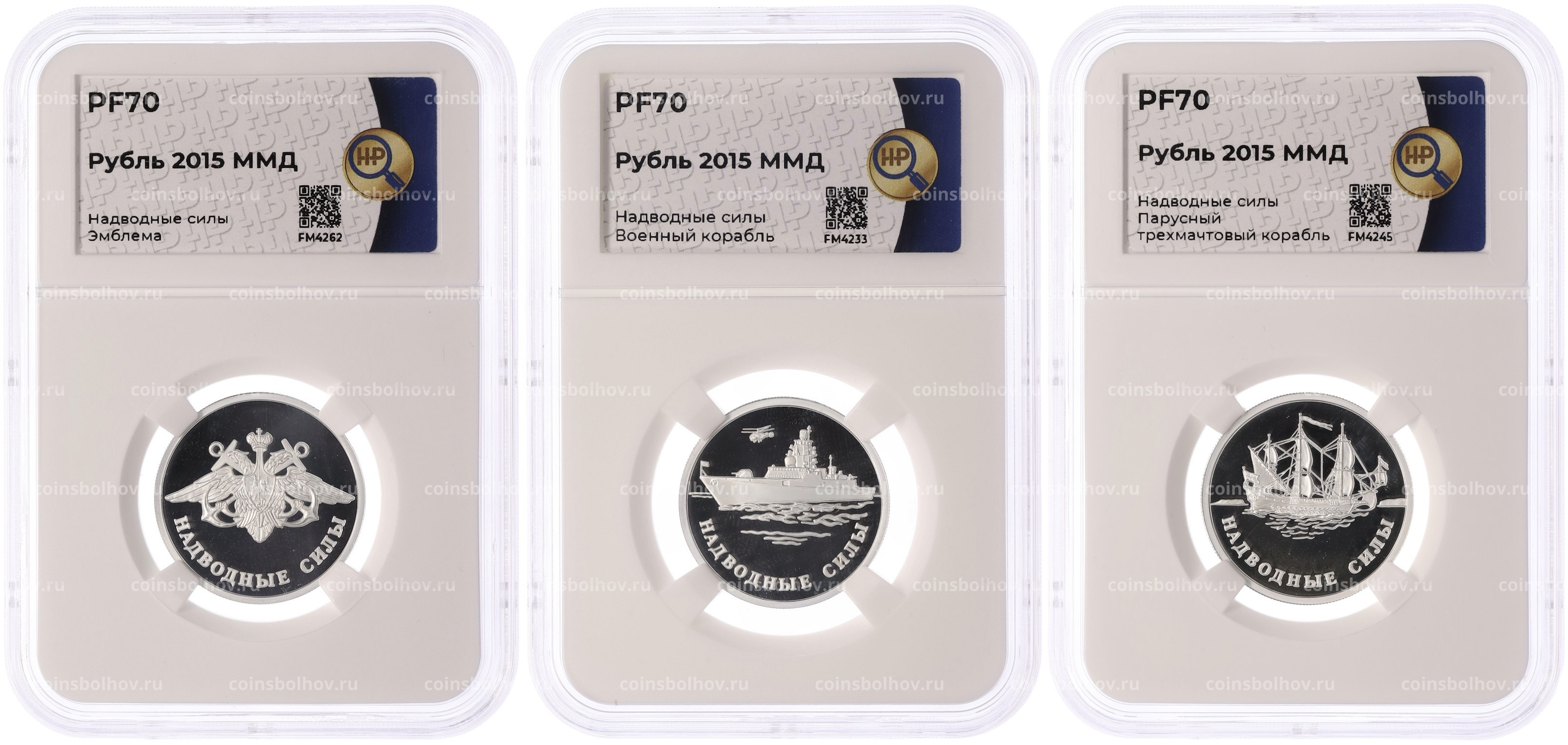 Набор из 3 монет 1 рубль 2015 года ММД «Вооруженные силы РФ — Надводные силы» в слабах ННР (Топ-грейд PF70)