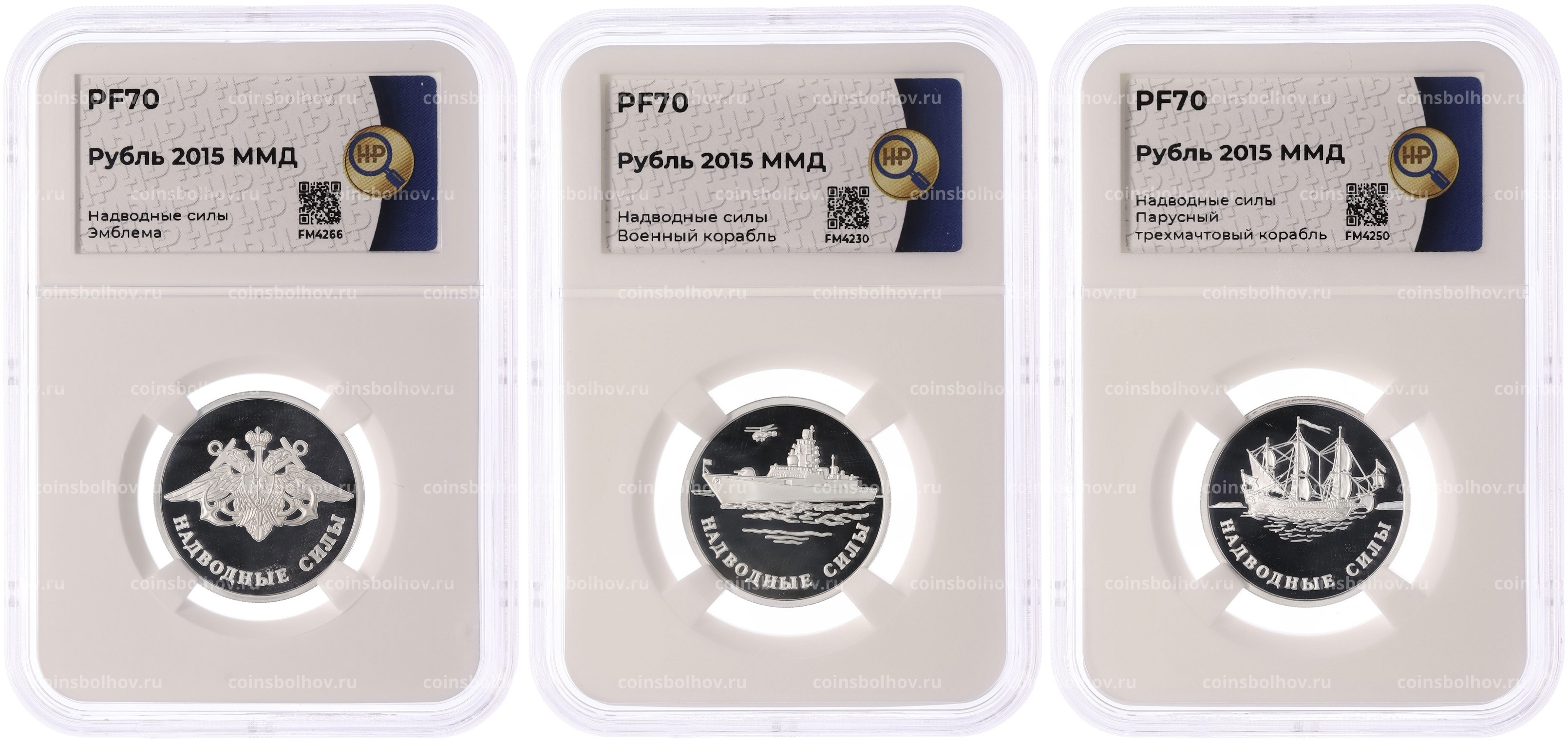Набор из 3 монет 1 рубль 2015 года ММД «Вооруженные силы РФ — Надводные силы» в слабах ННР (Топ-грейд PF70)