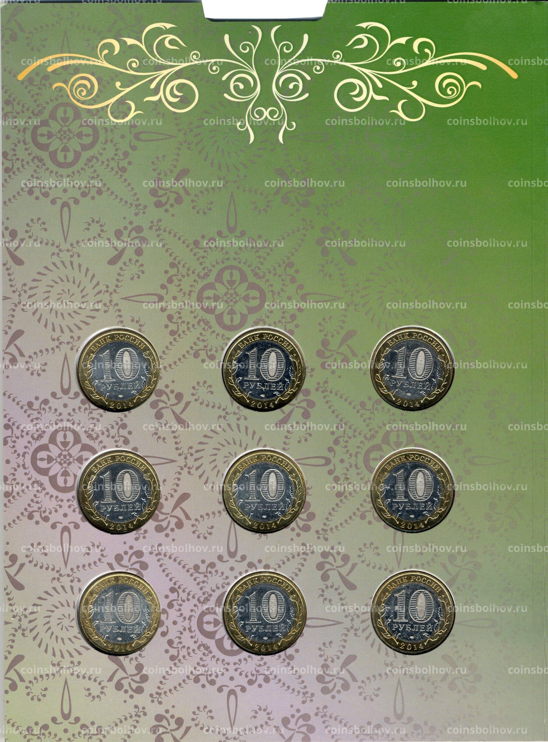 Набор состоит из 9 биметаллических монет номиналом 10 рублей.
