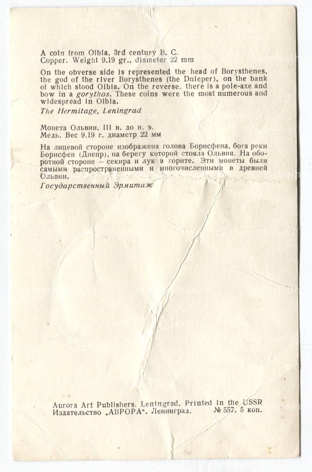 Открытка Монета Ольвии III век до н.э. Медь